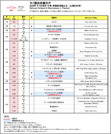 2026年タイの祝日・行事スケジュールタイの祝日・行事・酒類販売禁止日のスケジュールです。