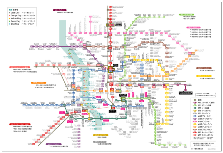 バンコクおよび近郊の交通路線図は、主要鉄道4路線で構成されています。スワンナプーム空港と市内を結ぶARL(エアポート・レール・リンク)、高架鉄道で観光やビジネスに便利なBTS(バンコク・マス・トランジット・システム)、地下を走り市内を網羅するMRT(メトロポリタン・ラピッド・トランジット)、ドンムアン空港方面と郊外を結ぶSRT(タイ国鉄)があり、中心部から近郊まで効率よく移動できます。公共交通が充実しており、旅行者にも分かりやすいのが特徴です。