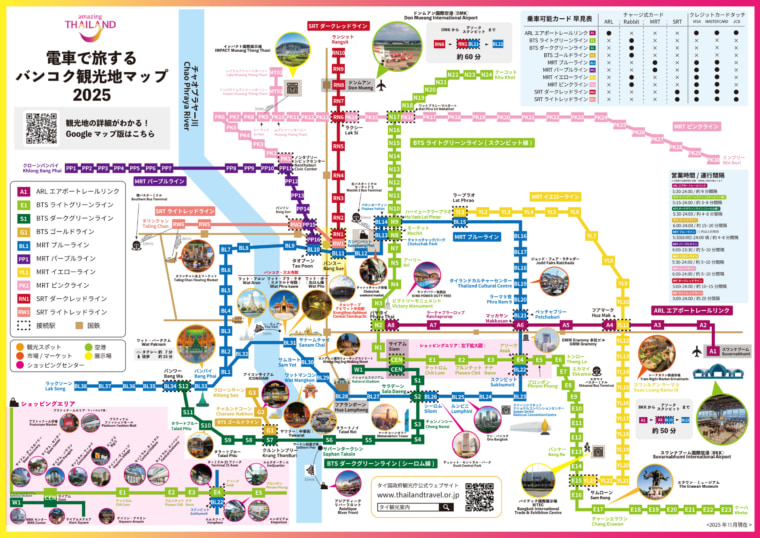 電車で旅するバンコク観光地マップは、ARL・BTS・MRT・SRTなど主要路線を一目で把握でき、空港から市内、近郊までの移動が分かりやすく整理されています。各駅周辺には寺院、マーケット、ショッピングモールなどの観光スポットが写真付きで表示され、電車を使った効率的な観光ルート計画に便利なマップです。