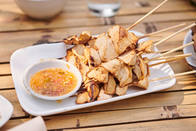 「ホアナム・マッシュルーム・ファーム」は、ナーン県の中心から車で約1時間の里山にあるきのこ料理レストラン。併設された農園からは毎日収穫したばかりのきのこが届き、その種類も様々。メニューはシンプルな串焼きや素焼き、フライやきのこのラープ、きのこピザなど、多彩。きのこをモチーフにした可愛いグッズが揃うショップでお土産探しをするのもおすすめです。
