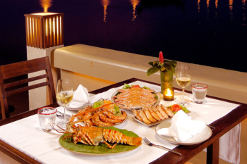 美しい景色を眺めながら、評判のシーフードディナーを堪能。港から車で30分ほどで、ホテルへ戻る途中に立ち寄れます。