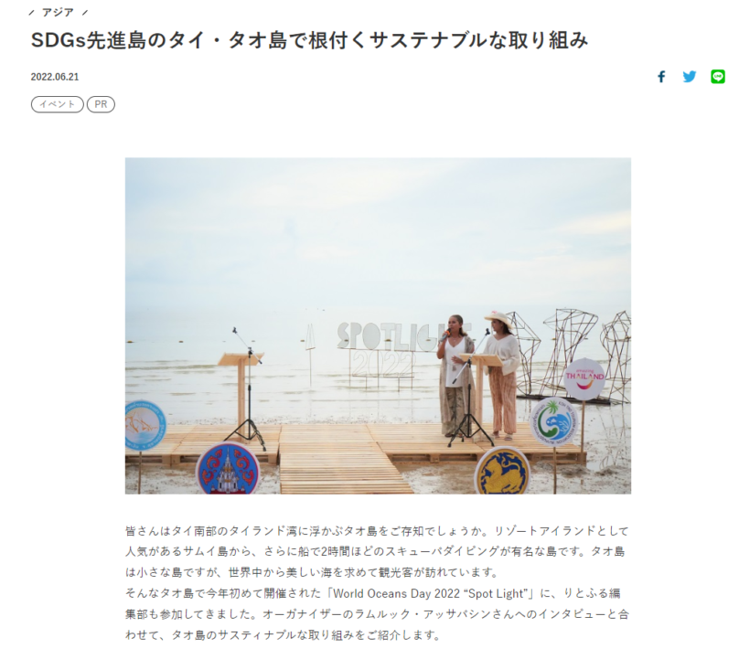 6月上旬、離島専門メディア「りとふる」の編集者が参加したタオ島でのSDGsイベント『World Oceans Day 2022 “Spotlight”』のレポートがUPされています。ぜひ下記よりご覧ください。