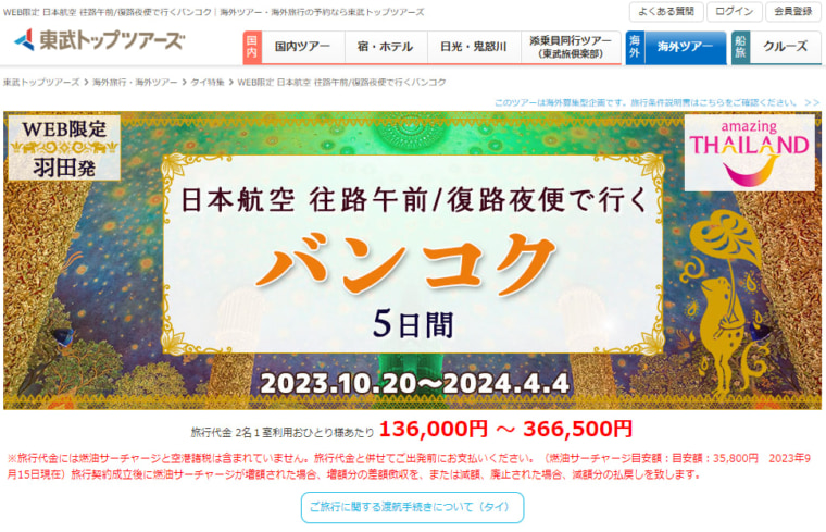 ニュースNews 【東武トップツアーズ】WEB限定ツアー『羽田発 日本航空 往路午前/復路夜便で行くバンコク 5日間』 2023/10/06 Tweet 東武トップツアーズ 羽田空港発着ツアー 東武トップツアーズではWEB限定の『羽田発 日本航空 往路午前/復路夜便で行くバンコク 5日間』を発売しています。 ツアーの詳細は下記画面をクリックしてください。 公式サイト: 外部リンク Tweet 前へ ニュース一覧 次へ