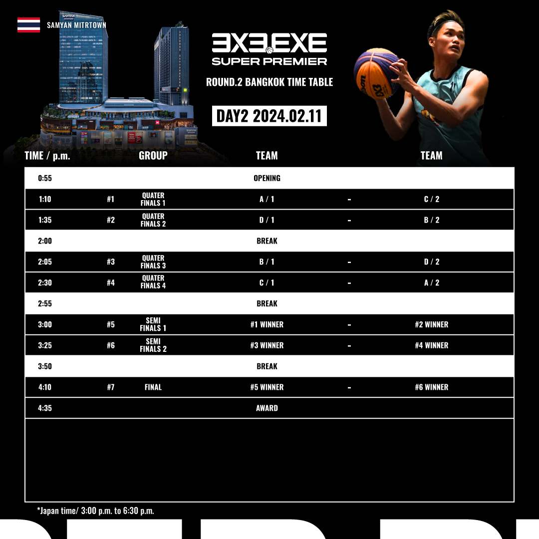3人制バスケの新リーグ『3 x 3.EXE SUPER PREMIER』が、2024年2月10日(土)・11日(日)に、バンコク市内のサムヤーン・ミッドタウンにて開催されます。タイムテーブル、出場チームと1日目のグループ分けが決定しましたので、MCやDJなどの出演者情報とあわせてご覧ください。