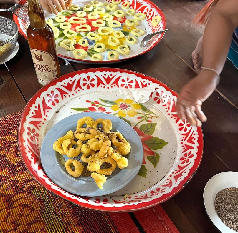 ▼ お茶請けに出してくれたぬれおかきのようなお菓子は、もち米をのばして棒状にカットしたものを揚げたもの。そのままでも十分おいしいですが、日本の醬油をつけて食べても合いそうな一品。