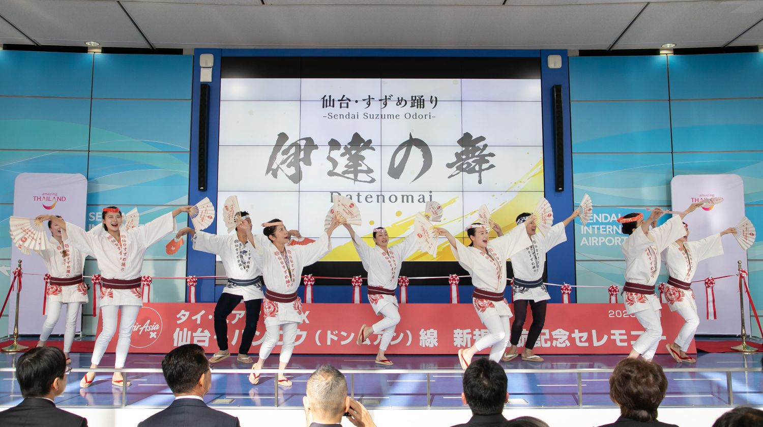 初便には、バンコクへの遠征に向かう地元のユースサッカーチームを含む約200名の旅客が搭乗しました。運航開始を記念して、仙台国際空港で「仙台-バンコク線 新規就航記念セレモニー」が開催され、仙台の伝統芸能「すずめ踊り」の披露が行われました。