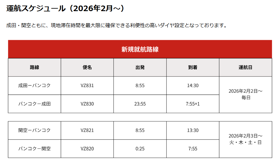 * 便名: VZ831便 成田 08:55発 → バンコク(スワンナプーム国際空港) 14:30着 — 運航日:毎日