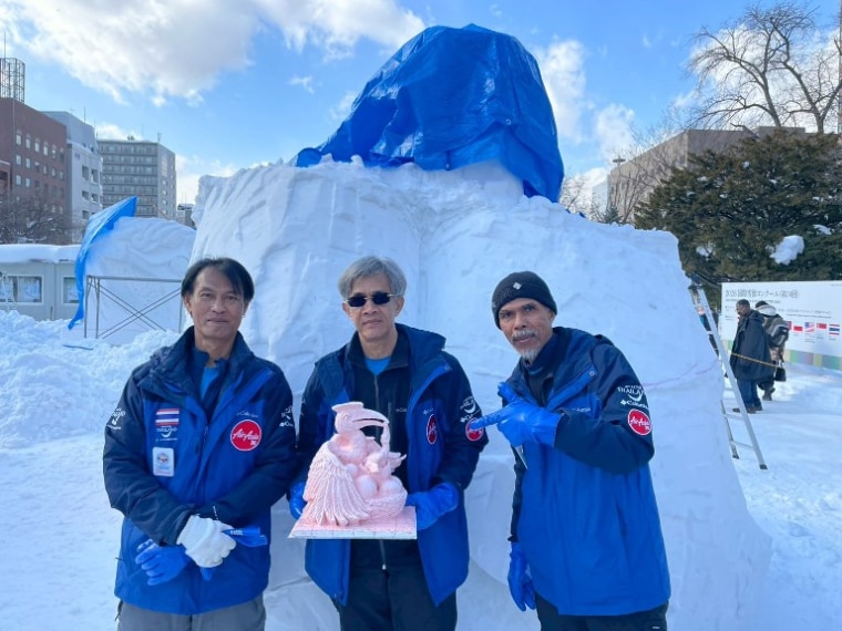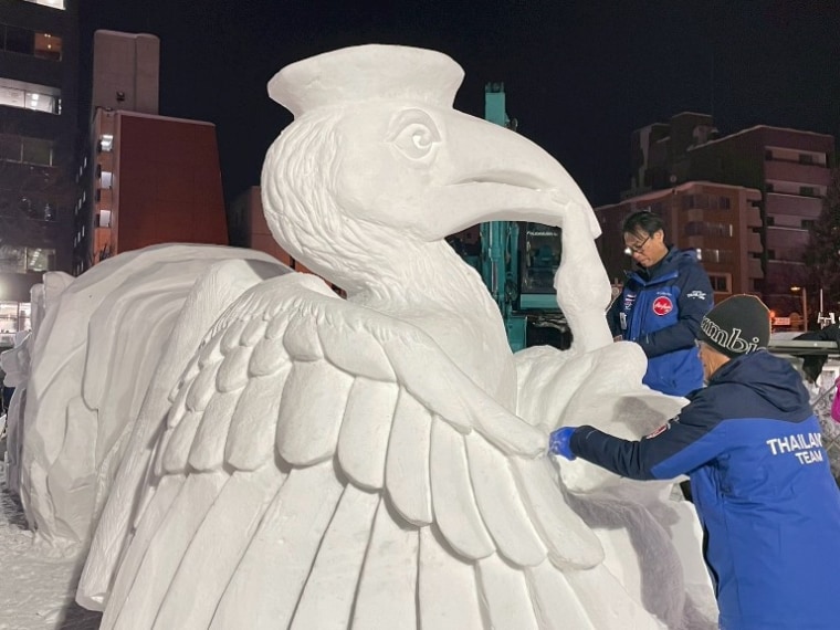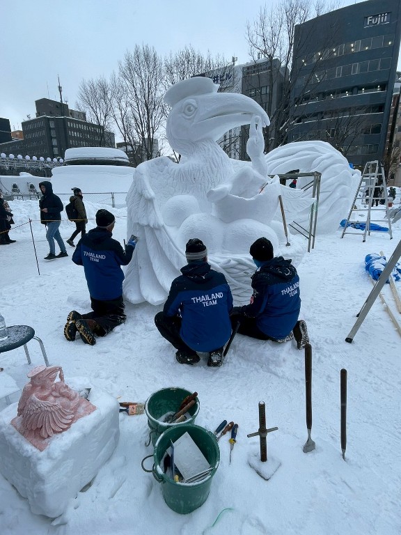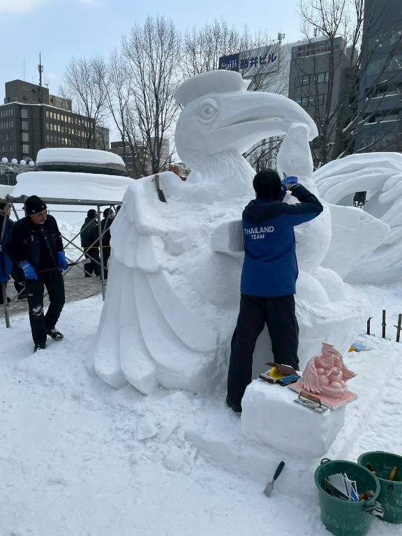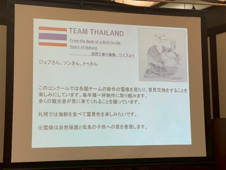 今年のタイチームのテーマは『自然と愛の象徴、サイチョウ』です。このテーマは、タイの美しい自然と、愛の大切さを表現しています。サイチョウは、タイの象徴的な鳥であり、愛と幸福をもたらす存在とされています。チームは、このテーマを通じて、自然と愛の調和を表現する雪像を制作する予定です。