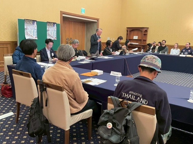 各国のアーティストが札幌に集い、健闘を誓い合う前夜。雪像制作に先立ち、参加各国のチームが一堂に会し、チームミーティングが行われました。