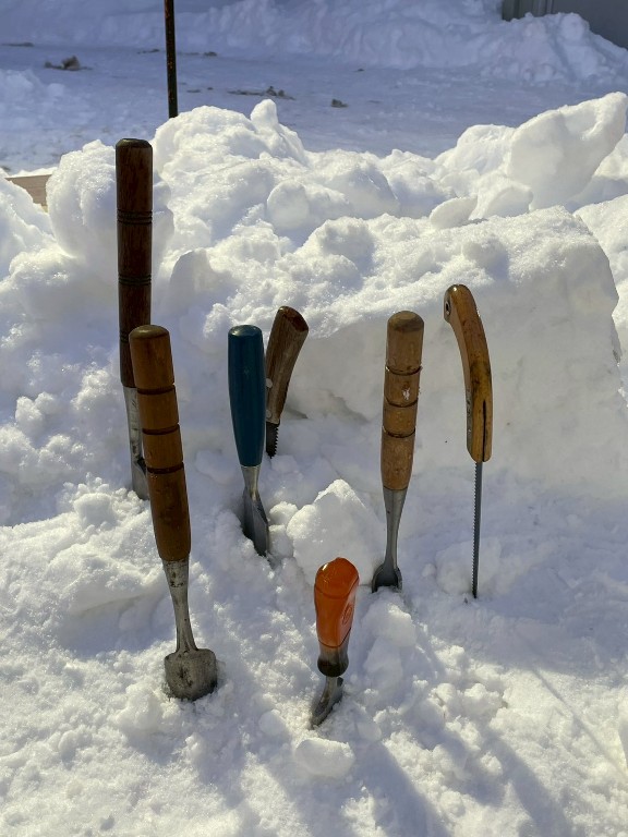 大きさも形もさまざまなノミや彫刻刀。この道具が、雪に命を吹き込みます。