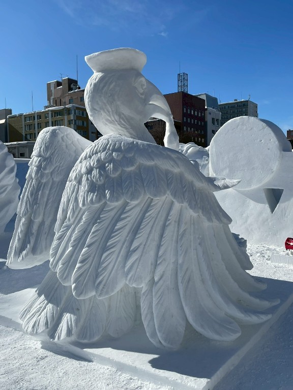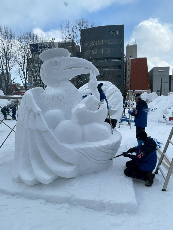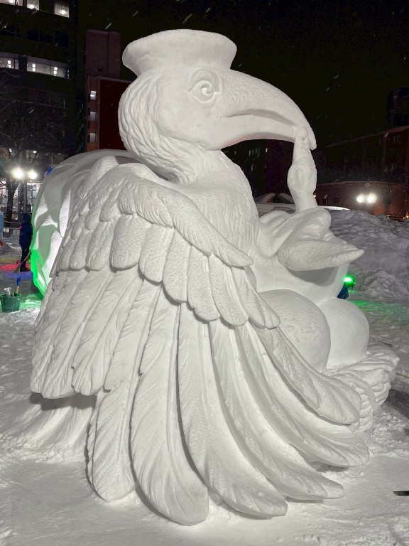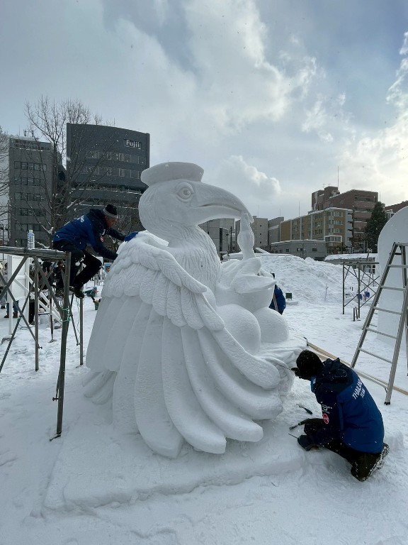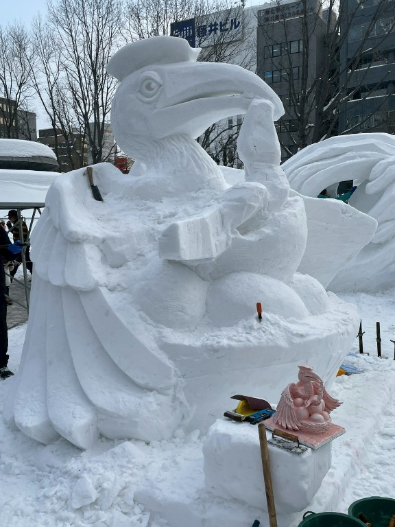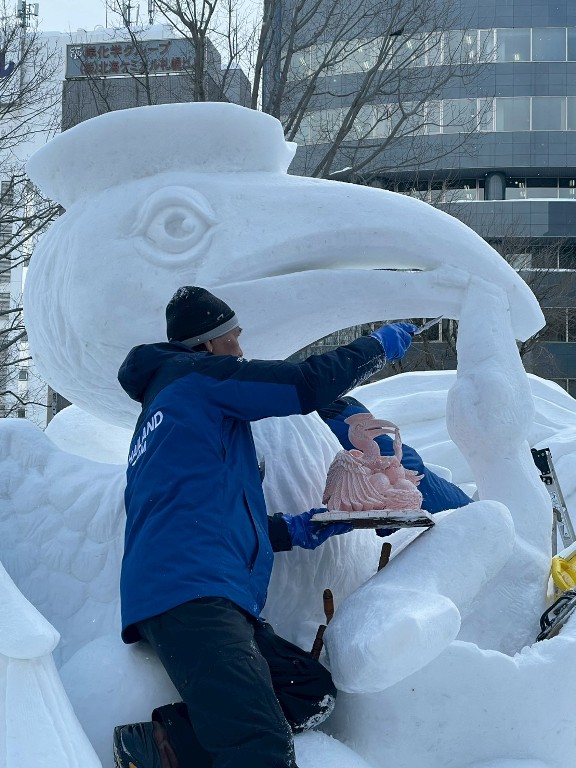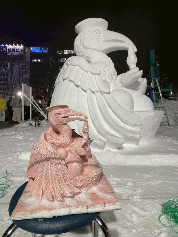 完成間近の雪像から、サイチョウが今にも動き出しそうな躍動感が感じられます。