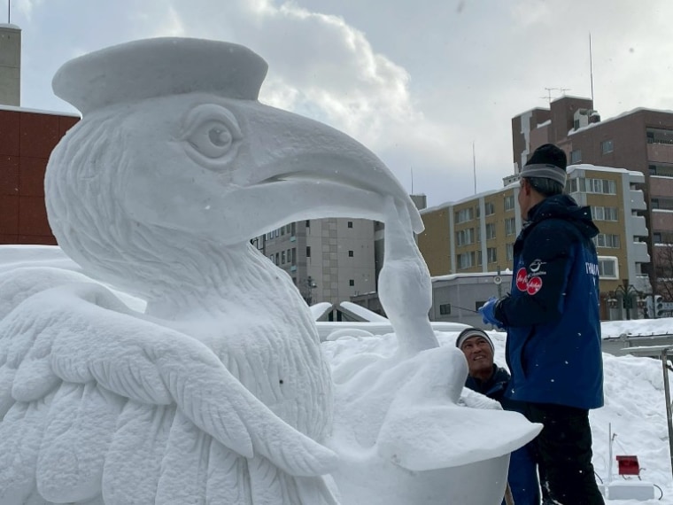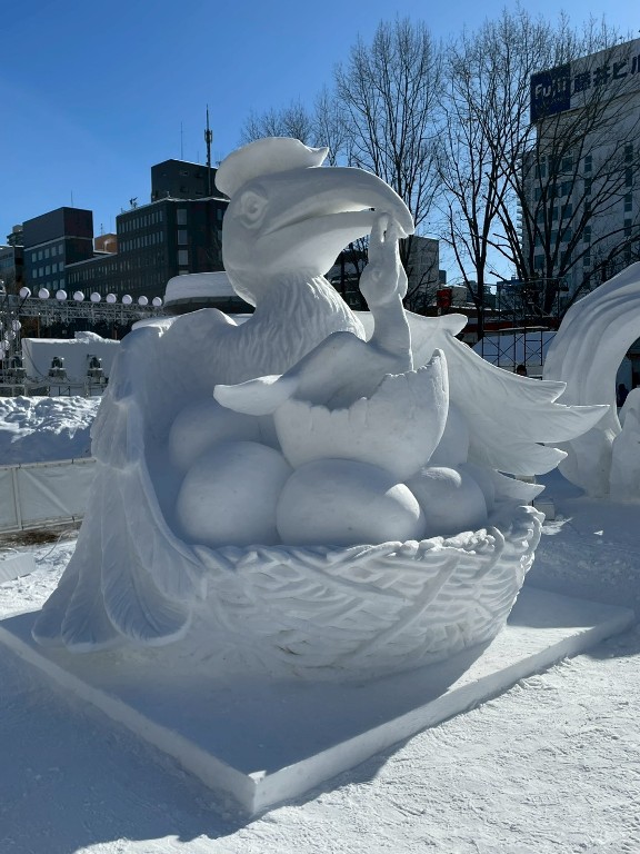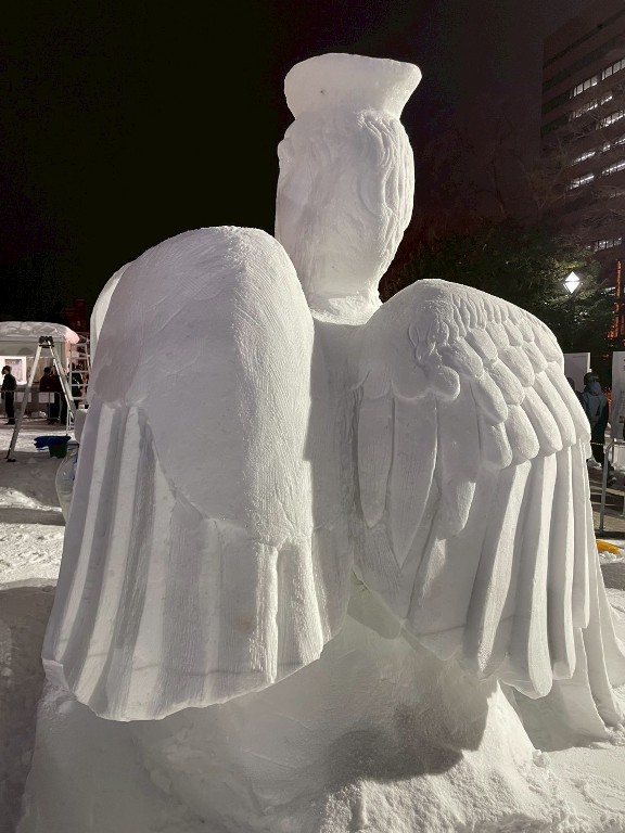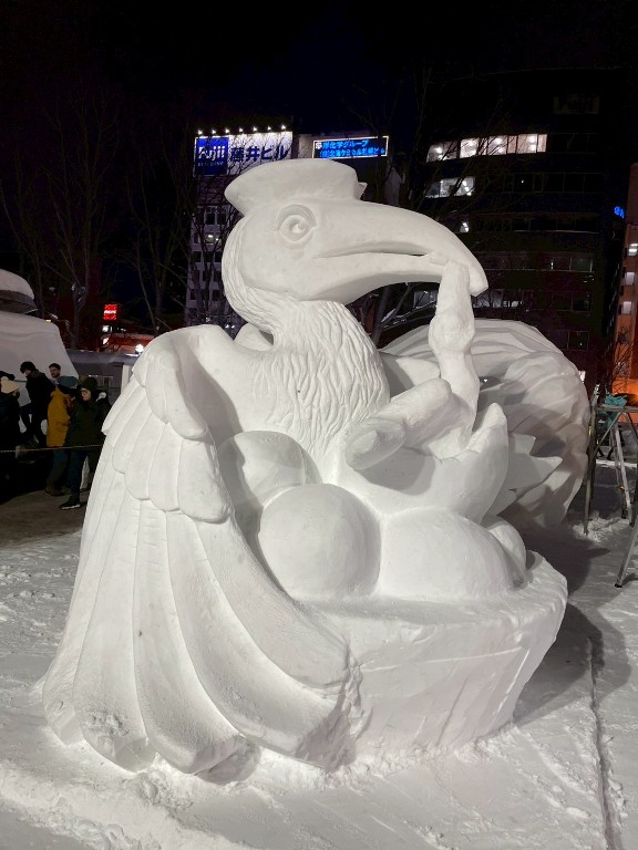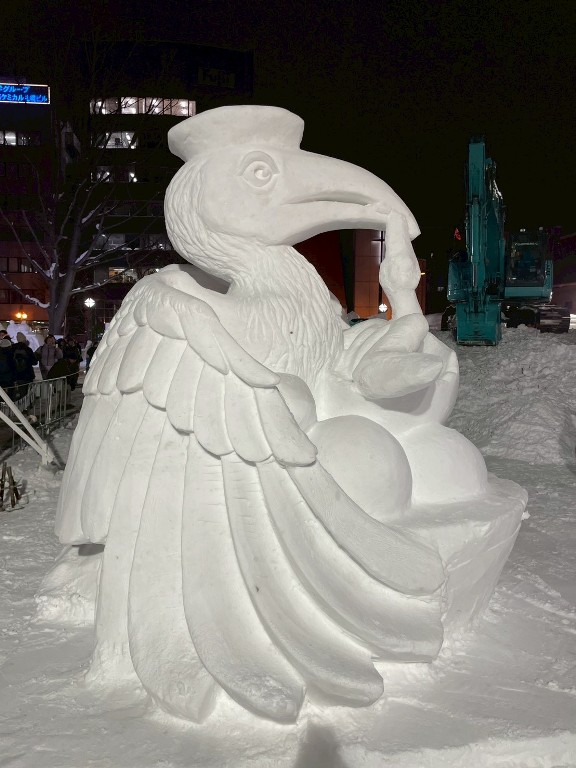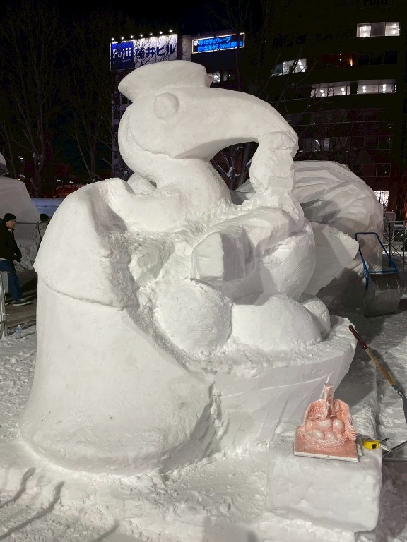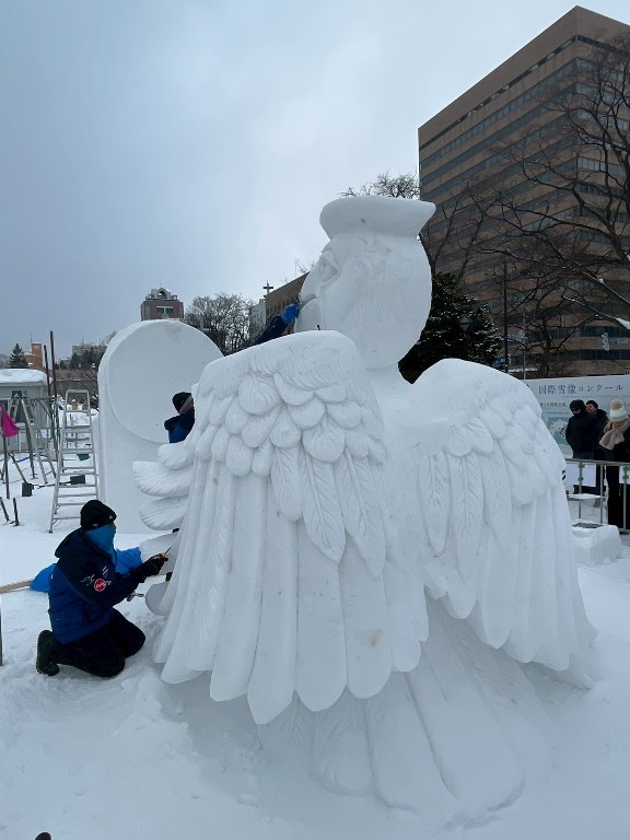 完成間近の雪像から、サイチョウが今にも動き出しそうな躍動感が感じられます。