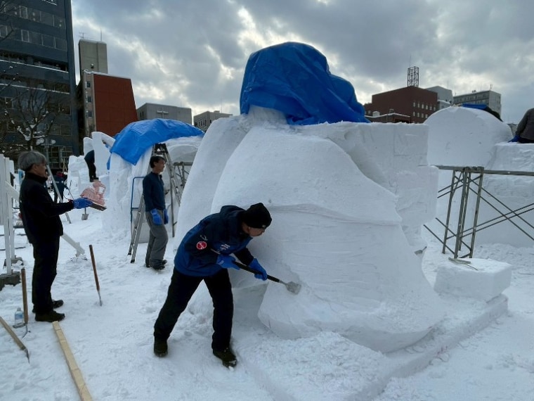 雪に包まれながら、チームが完成に向けて雪像の最終仕上げを行う様子