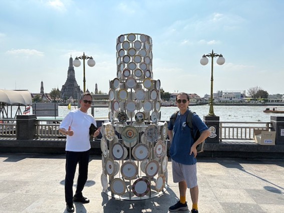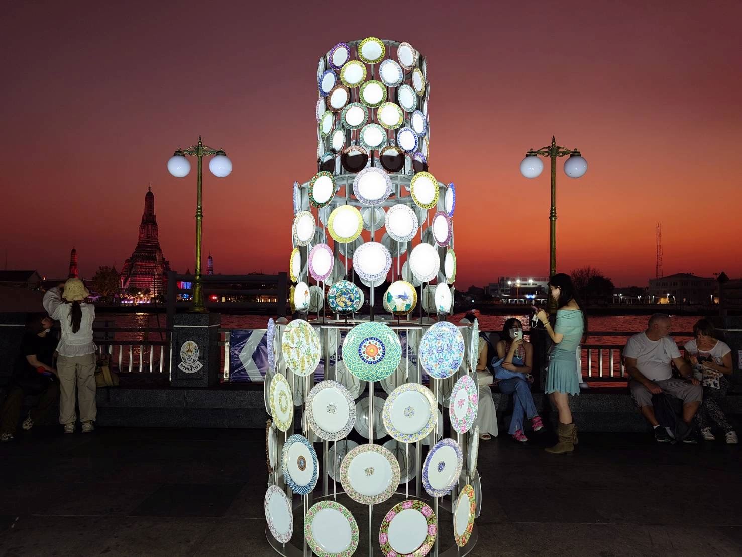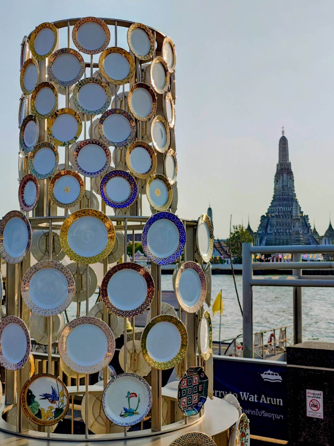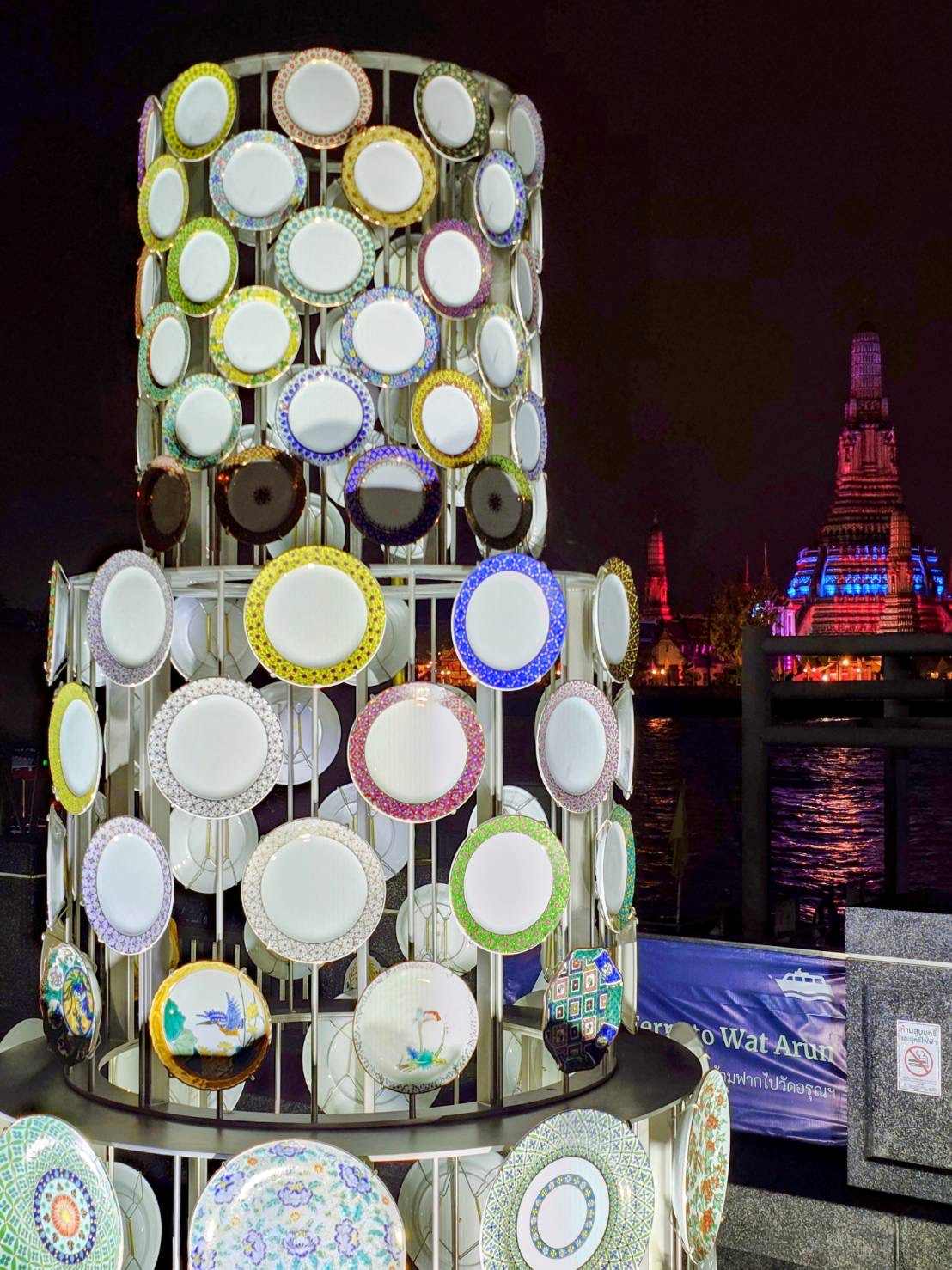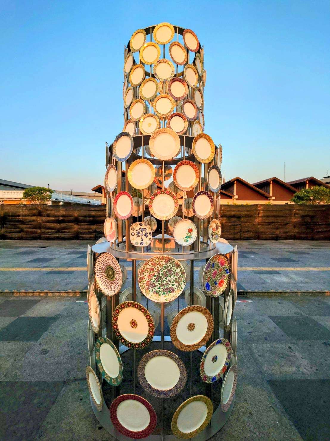 【作品コンセプト】 タイの建築史において、陶磁器と建築は分かちがたい関係にありました。かつて「ベンジャロン焼」は建物のファサードを彩る象徴的な素材でしたが、現代建築においてその姿を見る機会は少なくなっています。 藤堂教授が提案する「Tower of Dusk」は、対岸にそびえる「ワット・アルン(暁の寺)」と対話を試みるインスタレーションです。夕陽を反射し、夜には光を放つこの塔は、ステンレスケーブルで吊るされた140枚のベンジャロン皿によって構成されています。過去の遺産を呼び覚ましながら、建築における陶磁器の新たな可能性を約束する、未来へのマニフェストです。