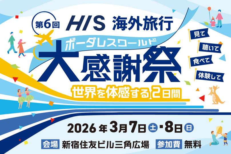 株式会社エイチ・アイ・エスがお届けする海外旅行の魅力を五感(“見る・聴く・食べる・体験する”)で楽しみながら再発見していただくことを目的とした第6回「HIS海外旅行大感謝祭」が、2026年3月7日(土)・8日(日)の2日間、都内新宿住友ビル三角広場にて開催されます。