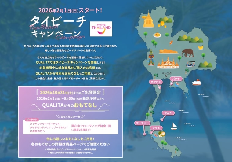 旅行会社エイチ・アイ・エスが展開する高品質ブランド「QUALITA(クオリタ)」は、2026年2月1日(日)より「タイビーチキャンペーン」を実施しています。対象期間中に新規予約のうえ、2026年10月31日(土)までに出発されるお客様へ、特別なおもてなしを提供する期間限定企画です。