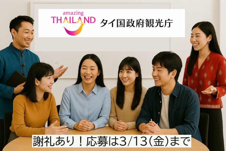 タイ国政府観光庁は、タイ旅行の現状や新たな魅力について、皆さまの忌憚のないご意見をお聞かせいただくため、2026年4月5日(日)タイ国政府観光庁東京事務所(東京都千代田区有楽町1-7-1 有楽町電気ビル 南館2階)にて、対面の座談会を実施いたします。下記募集内容をご確認の上、ご応募ください。尚、応募多数の場合は条件をもとに選考させていただきます。