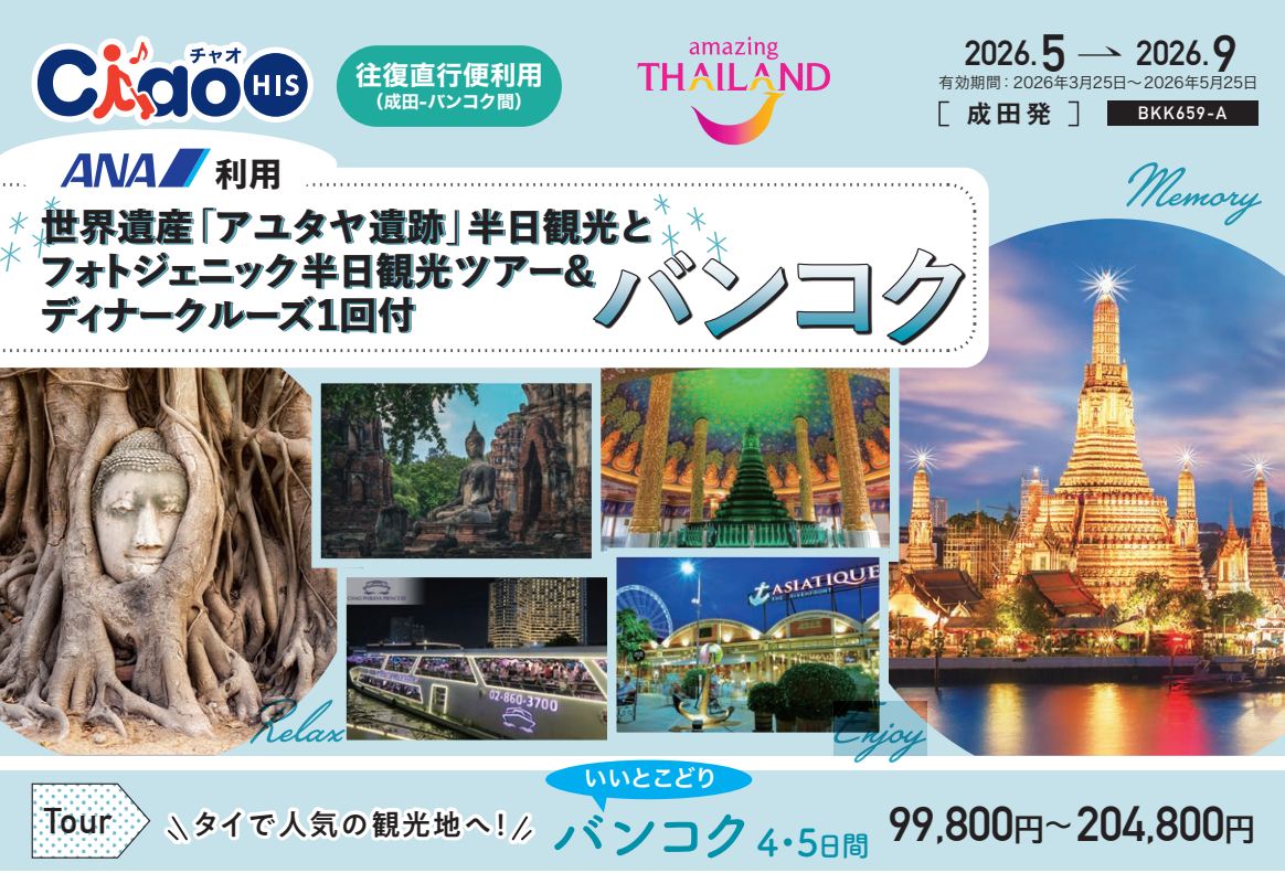 HISが贈る、タイ・バンコクの魅力を凝縮した「いいとこどり」な4・5日間のツアーをご紹介します! 往復ともにANA直行便を利用し、燃油サーチャージ込みの分かりやすい価格設定で、初めての方にもリピーターの方にもおすすめの内容です。