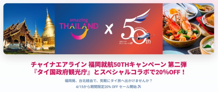 チャイナエアラインは福岡就航50周年を記念し、2026年4月15日よりタイ国政府観光庁との共同キャンペーンをを開始いたしました。