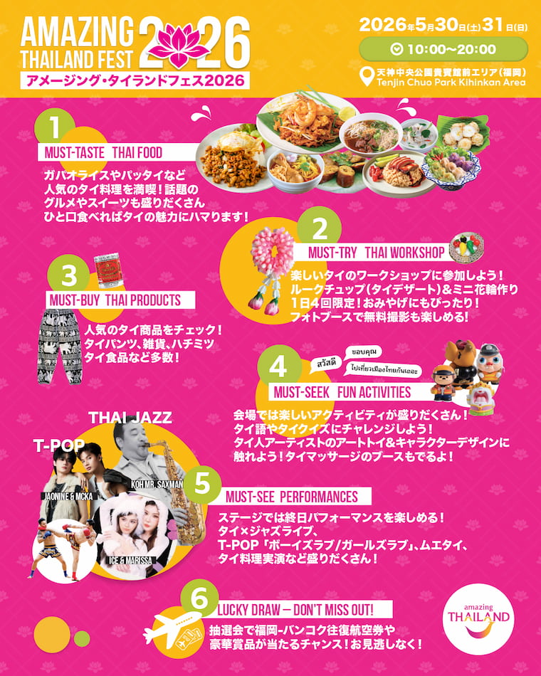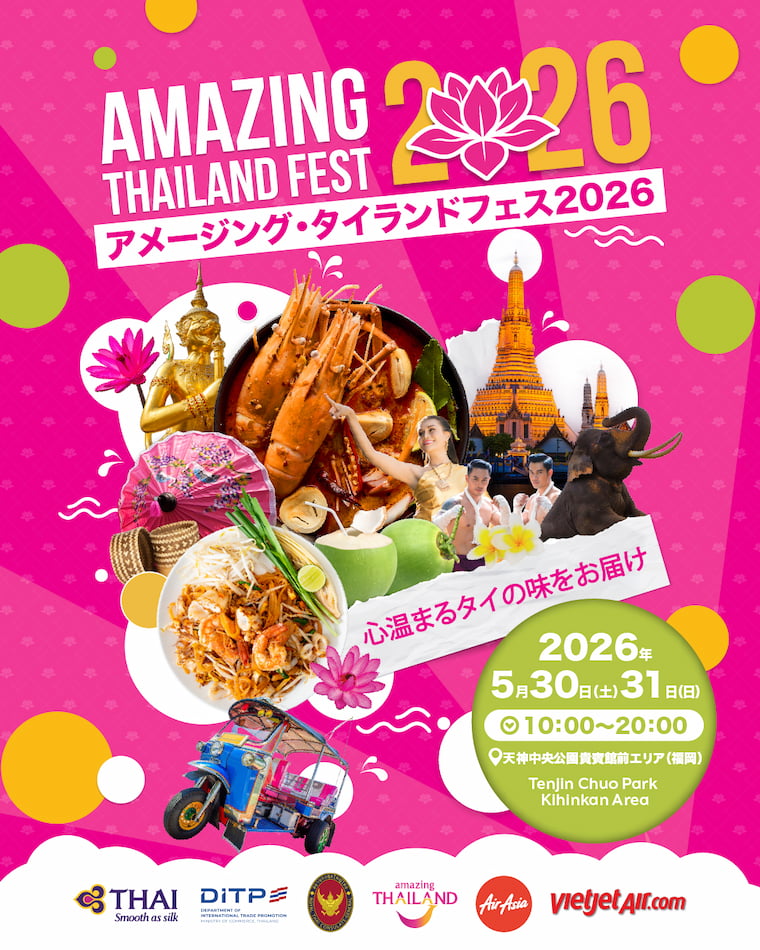 5月30(土)、31日(日)に「アメージング・タイランドフェス2026」を福岡市中央区の天神中央公園貴賓館前エリアにて開催します。大人気のタイ料理やドリンクをはじめ、雑貨等のタイ製品の販売、観光情報の発信、ステージパフォーマンス等多彩なコンテンツを2日間にわたってお届けします。タイ好きの皆さんには見逃せないイベントです。ぜひ足をお運びください。