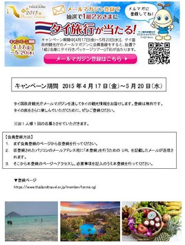 キャンペーン期間中、タイ国政府観光庁のメールマガジンに会員登録すると、抽選で1組2名様にタイ行きパッケージツアーが当たります。