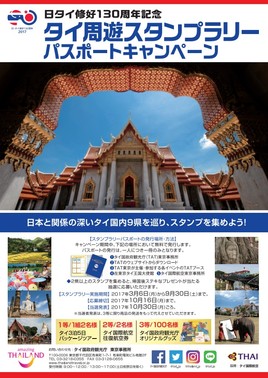 2017年は日タイ修好130周年です。タイ国政府観光庁(TAT)は、この記念すべき年に両国のさらなる友好を深め、観光分野における交流を推進していくため “タイ周遊スタンプラリーパスポート”キャンペーンを実施いたします。