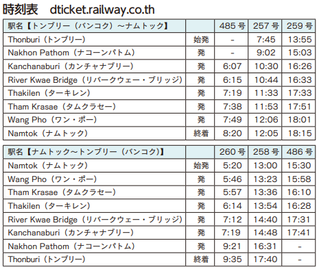 バンコク市内トンブリー地区のバンコク・ノイ駅発、カンチャナブリー経由ナムトック行きが1日2本[カンチャナブリーまで所要約2時間40分/ナムトックまで所要約4時間半]
